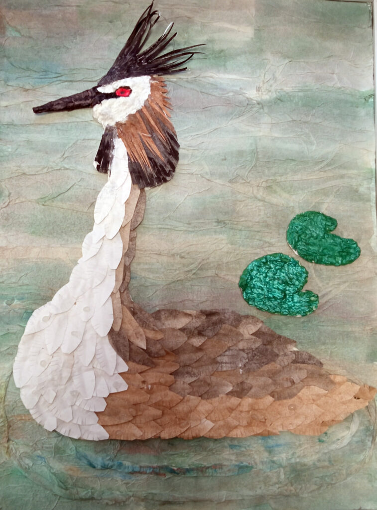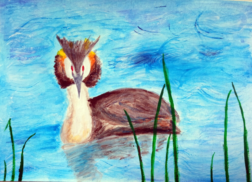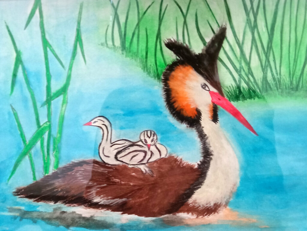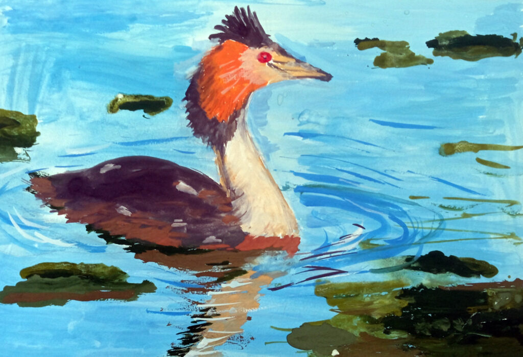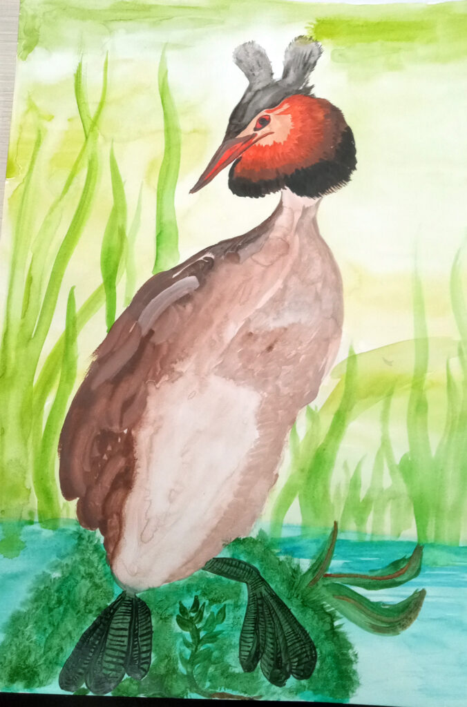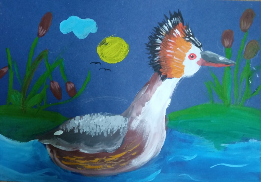 В номинации «Птица года» ребята в этом году рисовали очень необычную, и как оказалось, многим незнакомую птицу – Чомгу. На детских работах эта птица выглядит ярко, по- разному и исполнена в разных техниках.